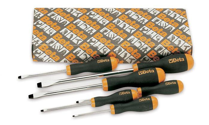 W skład zestawu wchodzą wkrętaki płaskie Beta 1201.